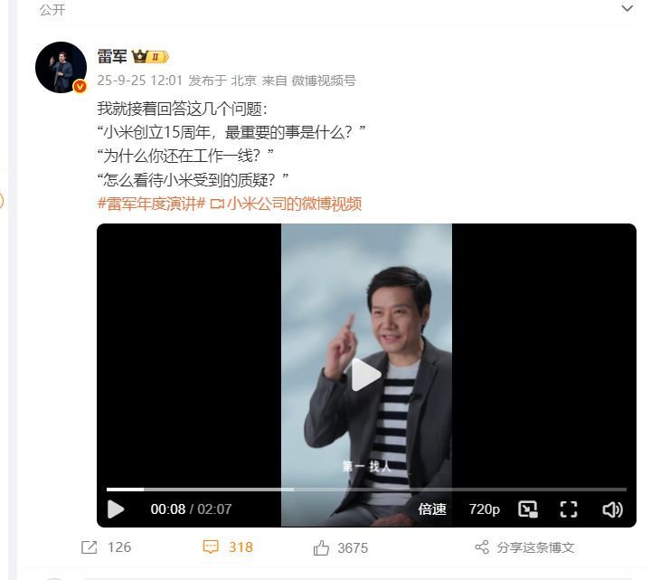 雷军还在最新的视频中回答了小米创立15周年,最伏击的事是什么,为什么还在责任一线等问题。