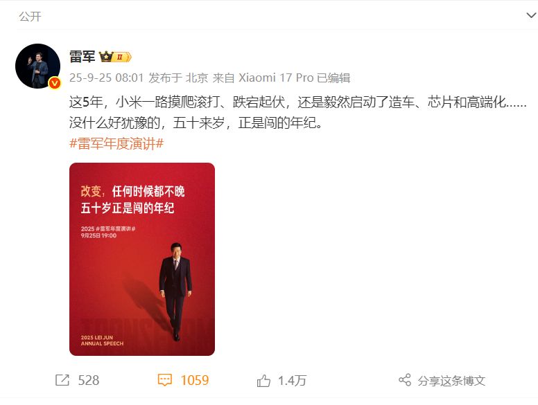 9月25日,小米集团董事长兼CEO雷军发微博称:这5年,小米沿途摸爬滚打、放诞革新,摇荡运行了造车、芯片和高端化……没什么好徬徨的,五十明年,恰是闯的年级。