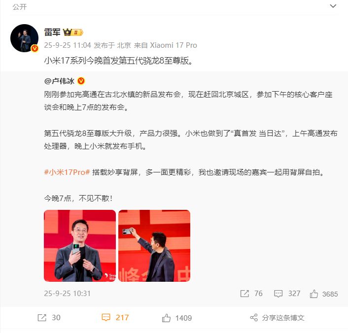 4、不少东谈主温文小米17系列的价钱。其实,上周卢总一经跟大家说过。小米17步调版,在大幅升级的同期,“加量不涨价”;小米17 Pro和小米17 Pro Max,定位会接续上探,订价晚上公布。
