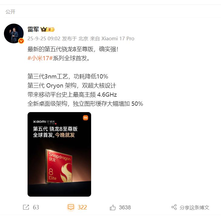 9月25日早间,小米澎湃OS官方微博肃穆宣布,小米17系列将于9月25日晚7点全球首发第五代骁龙8至尊版贬责器。这款采纳第三代3nm工艺的芯片,在功耗领略上比拟前代有显耀普及,为出动平台带来史上最高主频4.6GHz。